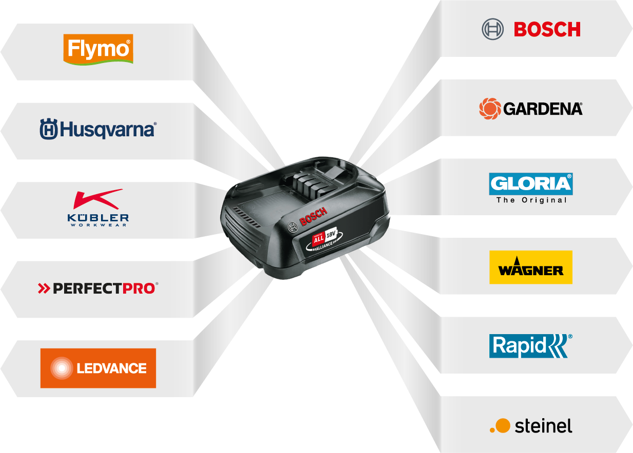 Šis akumulators ir POWER FOR ALL Alliance produkts, kas ir viena no lielākajām vadošo ražotāju dažādu zīmolu akumulatoru aliansēm. Šīs baterijas var izmantot visiem produktiem, kas ir daļa no šīs alianses*. Tas nozīmē, ka jums vairs nav jāpērk akumulators katram produktam. *Bosch PSM 18 LI + Bosch ALB 18 LI ir saderīgs tikai ar 1,5 Ah – 3,0 Ah akumulatora tipu.